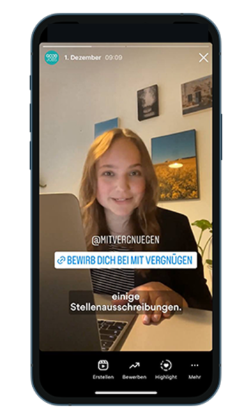 Mit unserer Company Story stellt ihr euch unserer Instagram Community authentisch vor und macht potentielle Kandidat*innen auf euch und eure Stellenanzeigen aufmerksam. Mit der Job Story stellt ihr ein konkretes Stellenprofil vor.