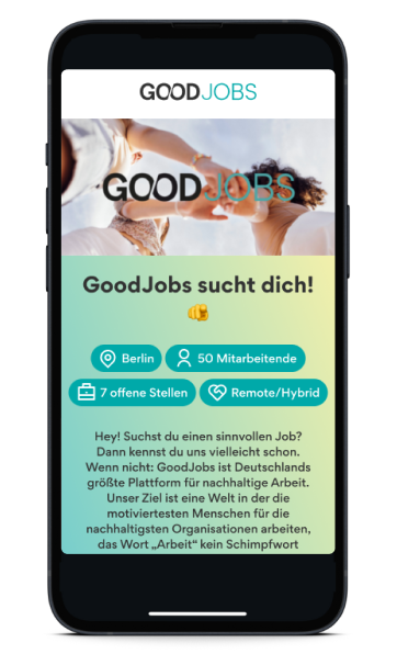 Direkt im Posteingang unserer Community: Ihr könnt eure Employer Brand bei > 40.000 Abonnent*innen vorstellen und so euren Jobs eine exklusive Bühne im GoodJobs Universum geben. Natürlich völlig DSGVO-konform.